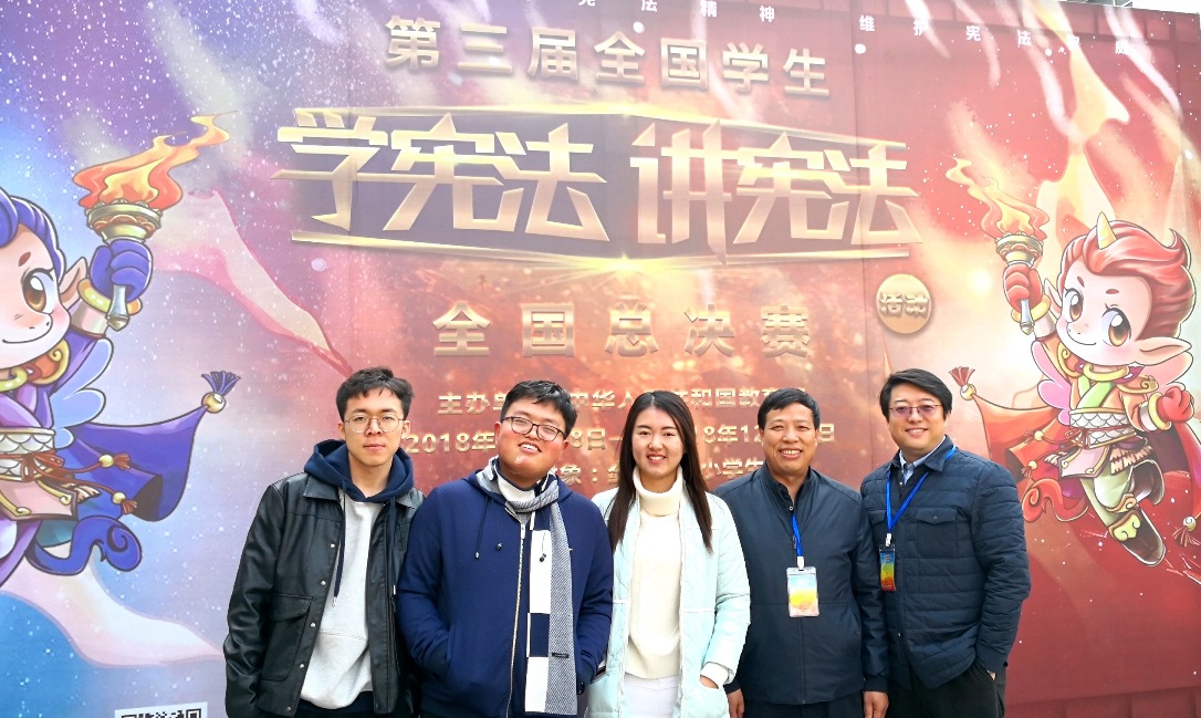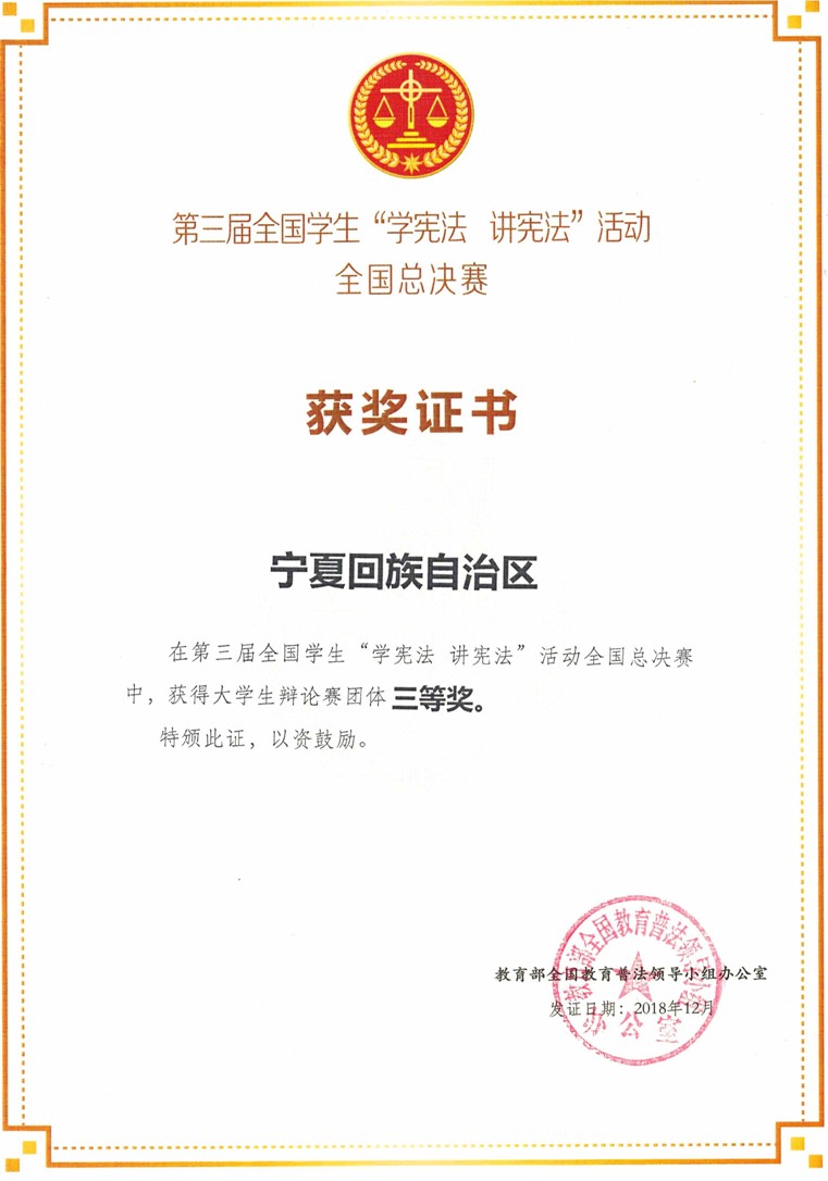 第三届全国学生“学宪法讲宪法”全国总决赛在第五个国家宪法日圆满收关,本次比赛由教育部主办,来自全国各省区、直辖市、香港和澳门特别行政区、新疆生产建设兵团共700余名师生参加了全国总决赛。英式21点法学专业本科生童鹏、张航溥、毛佳钰与区内其他院校代表组成宁夏回族自治区代表队赴京参赛,最终获得大学生辩论赛团体三等奖,知识竞赛二等奖,张弛和张蕊老师获得优秀指导教师奖。