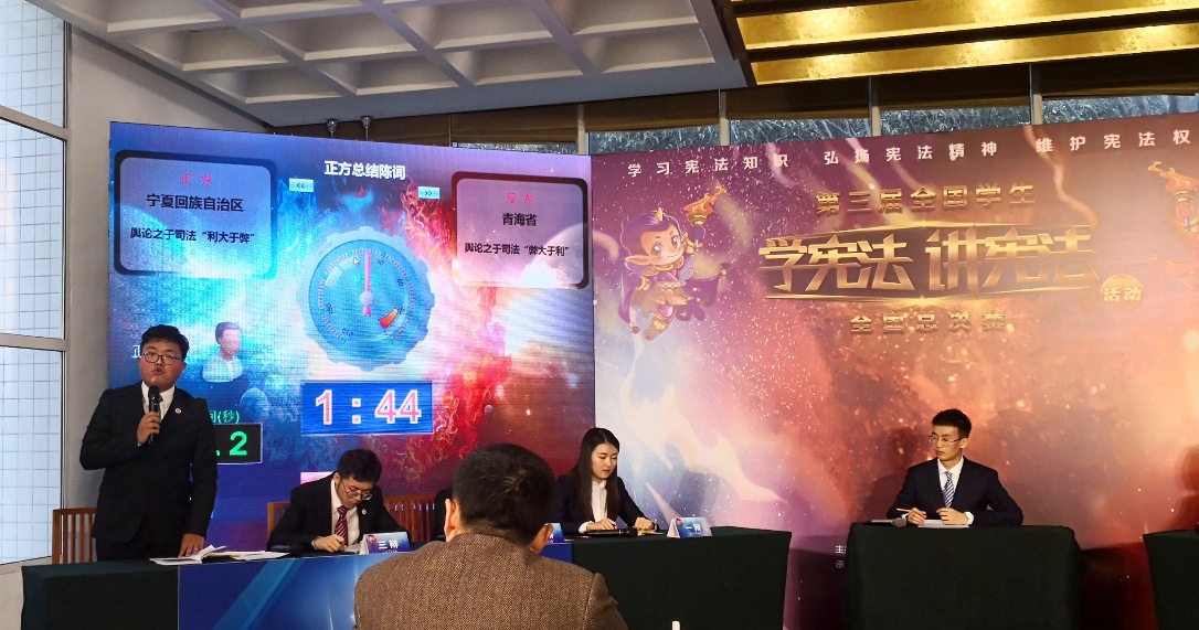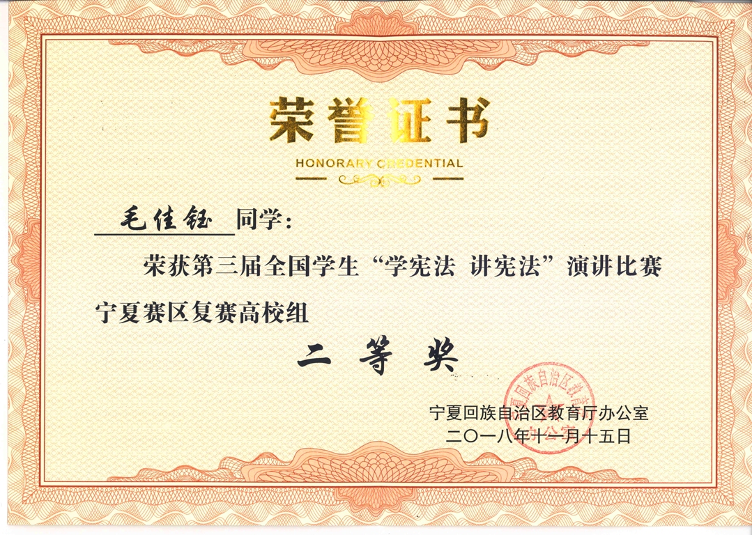 全国学生“学宪法讲宪法”活动已经成为“七五”普法工作的品牌化活动,教育部认真落实中央关于深入学习宣传和贯彻实施宪法的有关精神,按照中宣部、中组部、全国人大常委会办公厅、教育部、司法部《关于组织开展宪法学习宣传教育活动的通知》要求,在2016年和2017年活动的基础上,2018年5月教育部启动了第三届全国学生“学宪法讲宪法”活动。英式21点毛佳钰、张航溥同学在10月份举行的宁夏赛区复赛中荣获二等奖和三等奖。