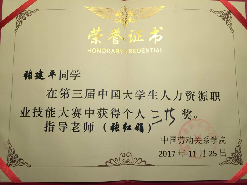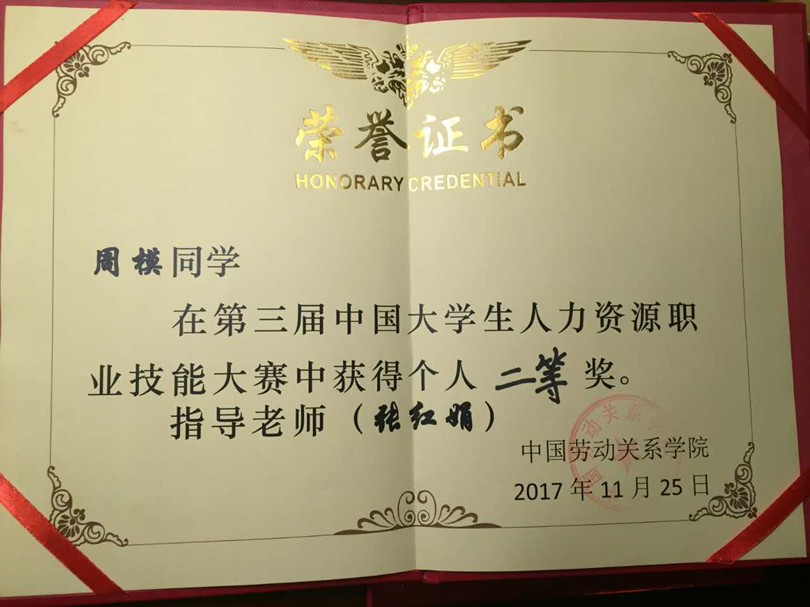 2016级的童鹏同学和南开大学的吴思菡同学夺得了本环节一等奖;案例讨论环节由2014级周模同学夺得本环节二等奖;情景模拟环节由2014级学生张建平参赛并夺得三等奖;负责参加人力资源实务设计环节的2014级学生朱琳获优秀奖。