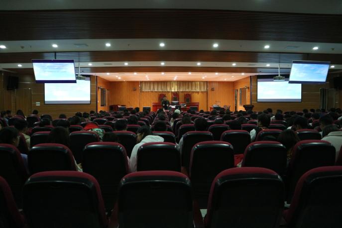 党委副书记崔明堂担任主讲,2019级全体本科新生到场聆听。