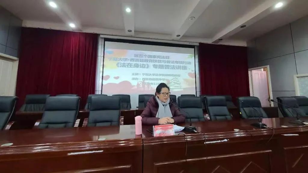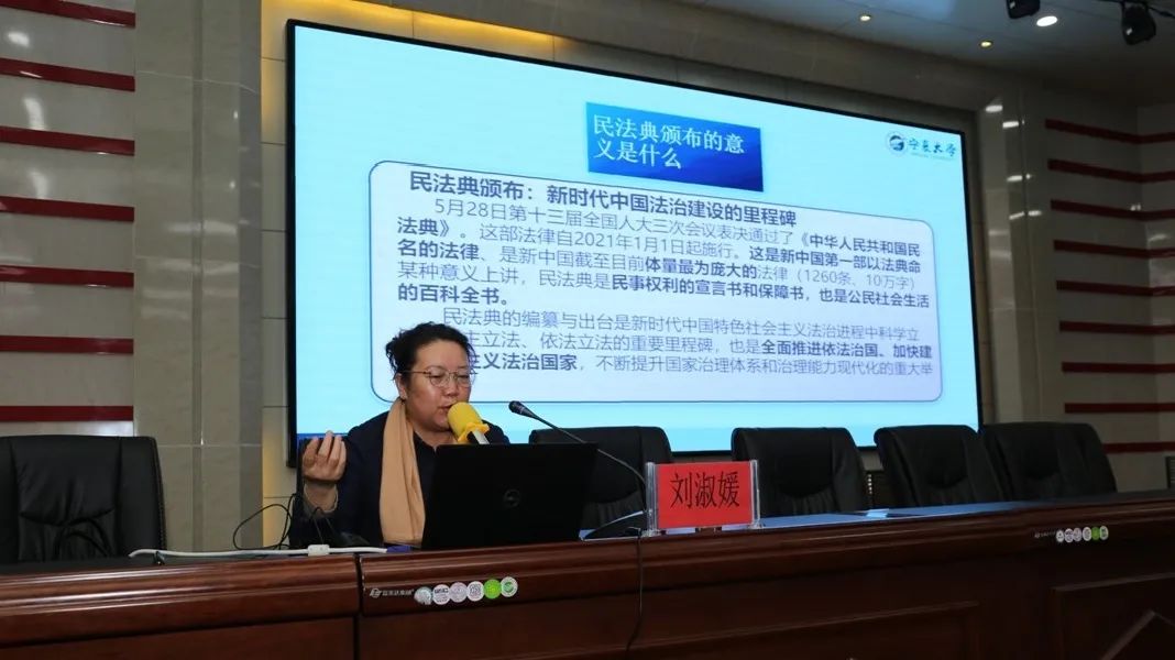 刘淑媛教授为西吉中学师生带来《民法典》专题普法讲座。她结合学校管理、教育教学、生活实际和真实案例,从“什么是民法典、民法典与宪法的关系、民法典颁布和实施的意义、民法典对未成年人的特殊保护、为什么要学习民法典”等几个方面,深入浅出的解读了《民法典》的现实意义。
