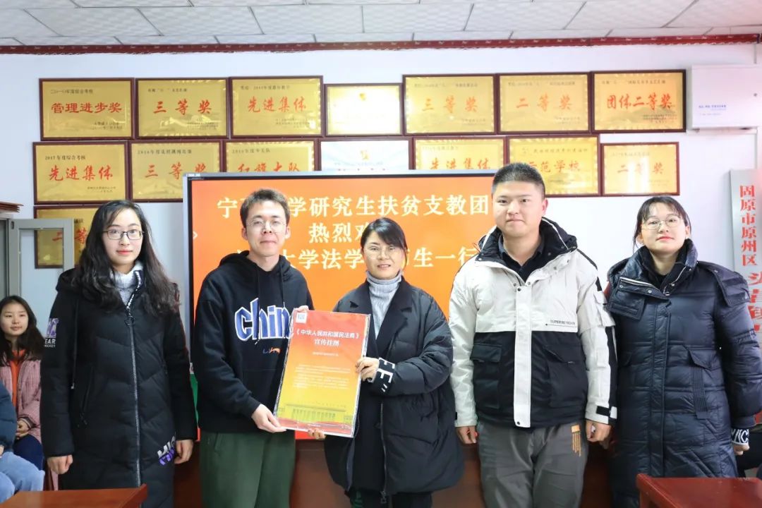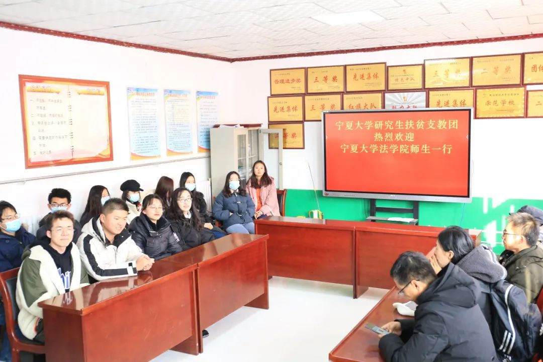 党委副书记杨扬,教师代表张弛、刘淑媛、滕明荣、张驰、马卫军、江兆涛、王静以及部分普法志愿者同学和一名随行校医,一起前往固原市原州区头营镇马庄小学探望在那里支教的我校学生。