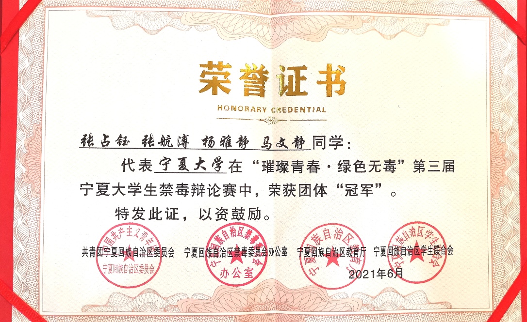 积极组织、精心筹备、广泛动员,辩手和指导教师刻苦训练、积极备战,最终在院长助理张弛和4位优秀辩手的努力奋战下,一路过五关斩六将,夺得本届大赛冠军,我校在全区大学生禁毒辩论赛中实现三连冠。