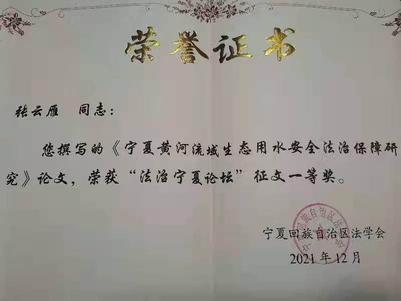 第七届“互联网+”大学生创新创业大赛高教主赛道优秀奖。在课程思政的教学过程中,不断深入理论研究,主持并完成宁夏法学会环境法方面的课题研究项目,其中《宁夏黄河流域生态用水安全法治保障研究》获宁夏回族自治区“法治宁夏论坛”论文一等奖。参加水利部、河南省法学会举办的“黄河生态保护和高质量研讨会”,参会论文获三等奖。