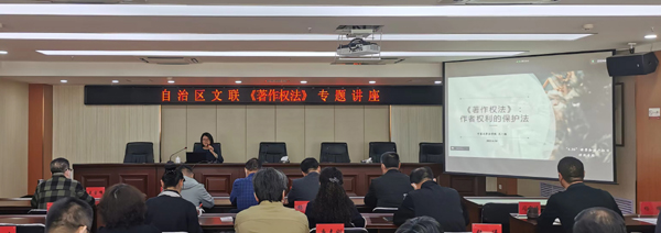 本次专题讲座作为自治区文联“强化知识产权保护 凝聚文艺创新力量”——知识产权宣传周系列活动之一,采取线上线下方式同步进行,全区文联系统和部分文艺工作者等80余人参加。通过讲座进一步提高了文联组织和文艺工作者知法学法守法用法的意识,提升依法维权的意识和能力,促进了倡导尊重知识、崇尚创新、天朗气清的良好风尚。