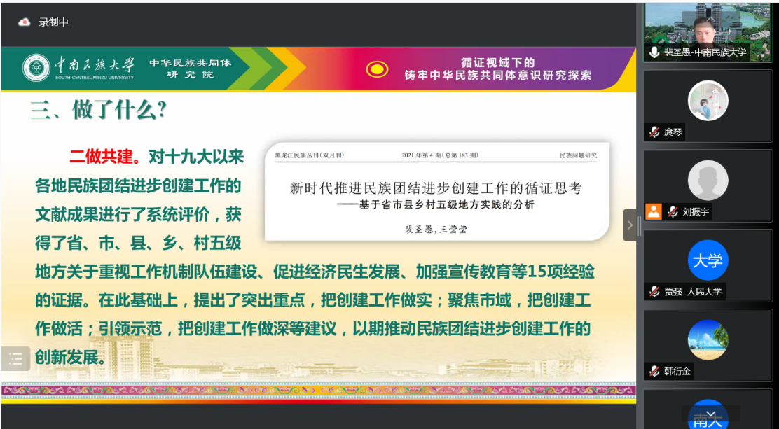 讲座中裴圣愚主要围绕为什么、是什么、做了什么、反思什么四个方面将循证科学引入铸牢中华民族共同体意识研究展开讲座。首先,裴教授对研究背景进行讲解,而后他系统地讲述了循证的定义,循证科学的发展历程、理念方法和研究现状,紧接着围绕如何在铸牢中华民族共同体意识研究中应用循证方法,介绍了循证科学对铸牢中华民族共同体意识研究的意义、价值、可行性,以及裴教授及其团队在民族团结进步创建和基层民族工作等方面的循证研究成果。最后,裴圣愚讲述了循证科学在铸牢中华民族共同体意识研究中的应用与反思。