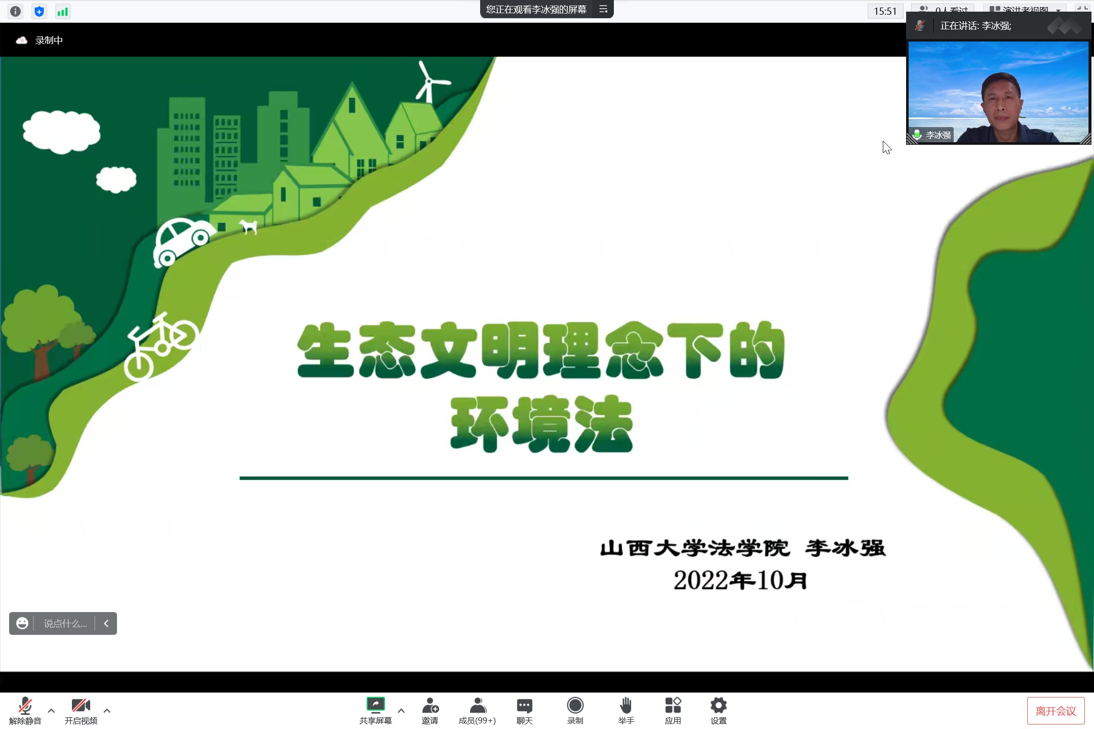 与谈环节,张云雁、施海智与李冰强进行了视频连线,就各地生态环境治理的典范进行交流,对人与自然和谐共生理念中蕴含的法理知识以及生态补偿制度分享了各自的看法。参会同学积极参与互动,将本次讲座推到了一个新的高潮。