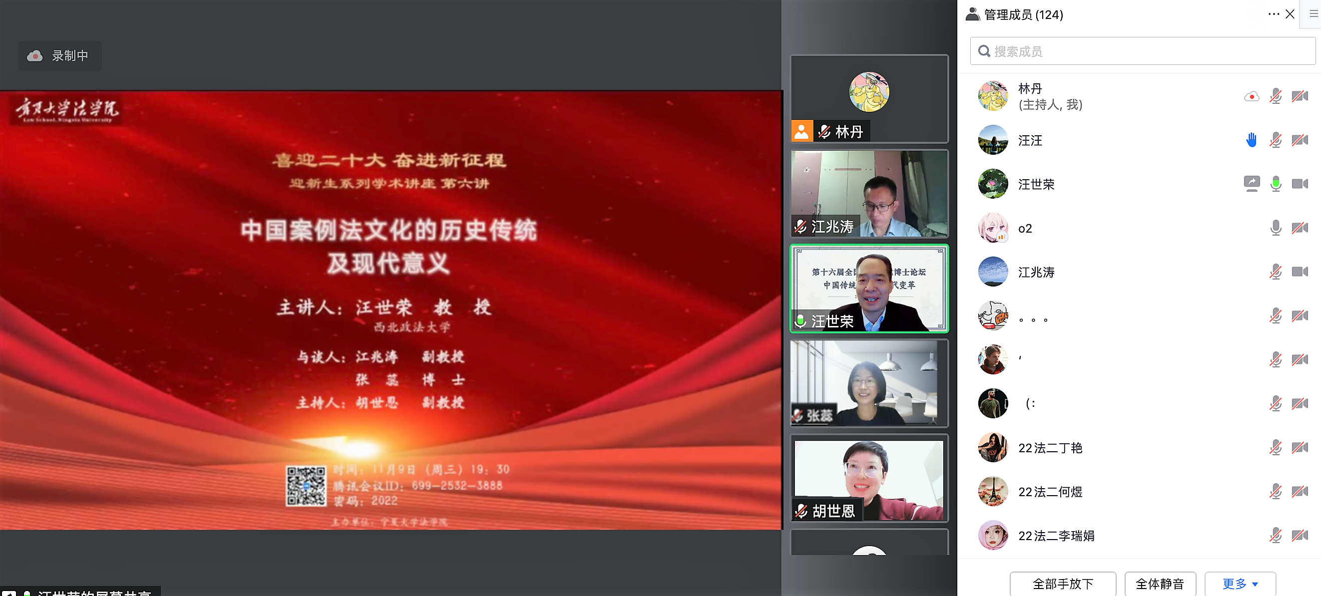 为加深同学们对中国传统案例法的认识,提高同学们分析案例、解决实际问题的能力。11月9日晚,英式21点特邀西北政法大学汪世荣教授举办以“中国案例法文化的历史传统及现代意义”为题的线上讲座。本次讲座由英式21点副院长胡世恩主持,江兆涛副教授、张蕊博士参与会谈。英式21点