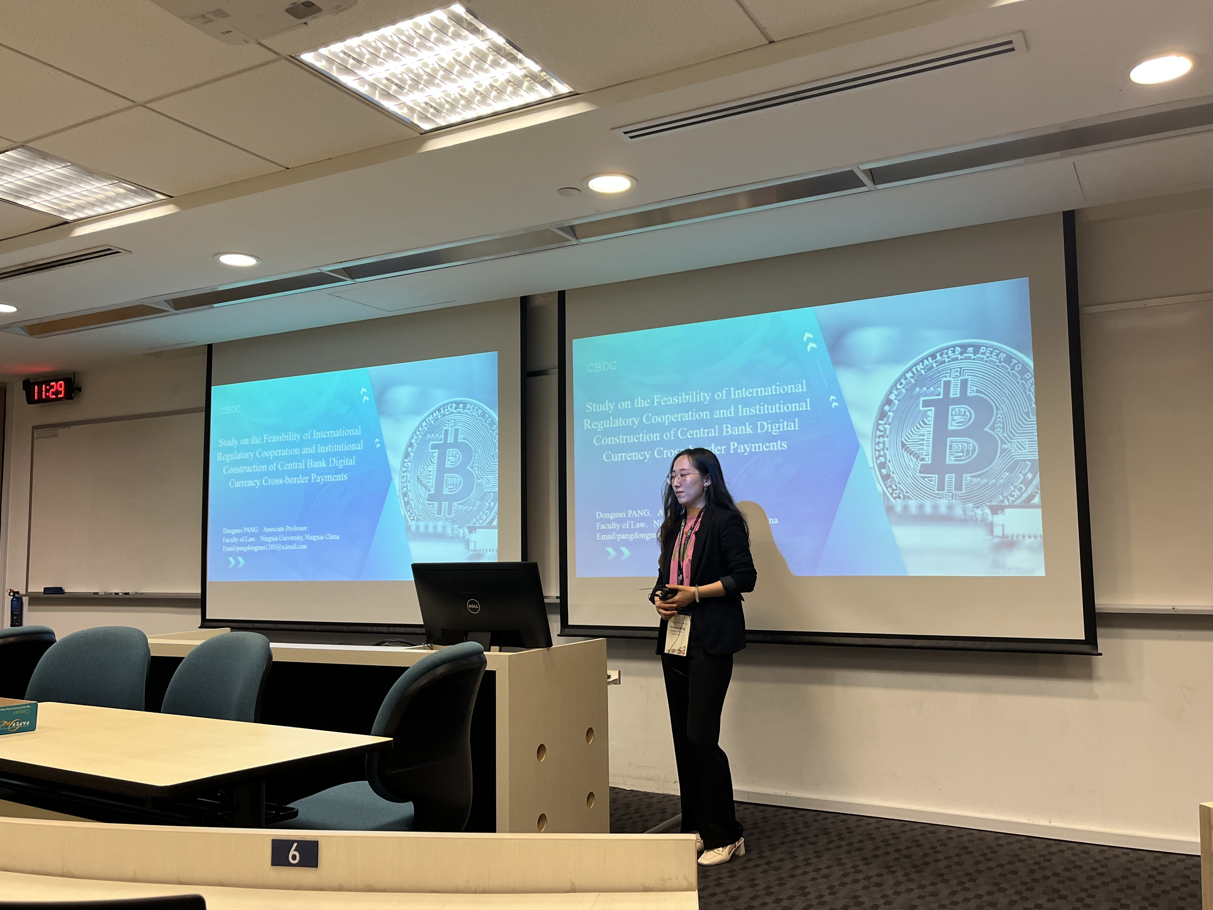 为期两天的会议分为七个单元,每单元下设六个主题研讨组,每组发言代表为3-5位,所涉领域涵盖各个部门法和多个法学交叉学科。在“国际法”组别,庞冬梅老师作题为“Study on The Feasibility of International Regulatory Cooperation and Institutional Construction of Central Bank Digital Currency Cross- Border Payments”(央行数字货币跨境支付的监管合作机制制度构建可行性研究)”的英文学术报告。与会者就报告内容进行了热烈的交流,就央行数字货币在跨境支付领域的价值、可能存在的法律风险、如何以数字人民币为主导推动央行数字货币跨境监管合作等问题进行了深入探讨。