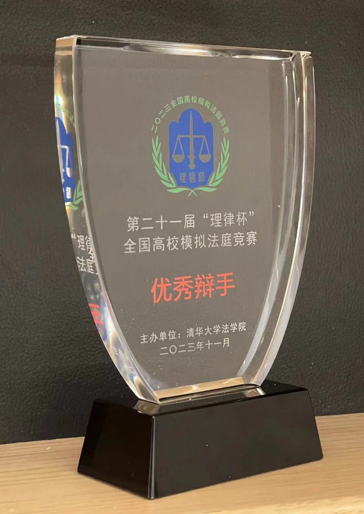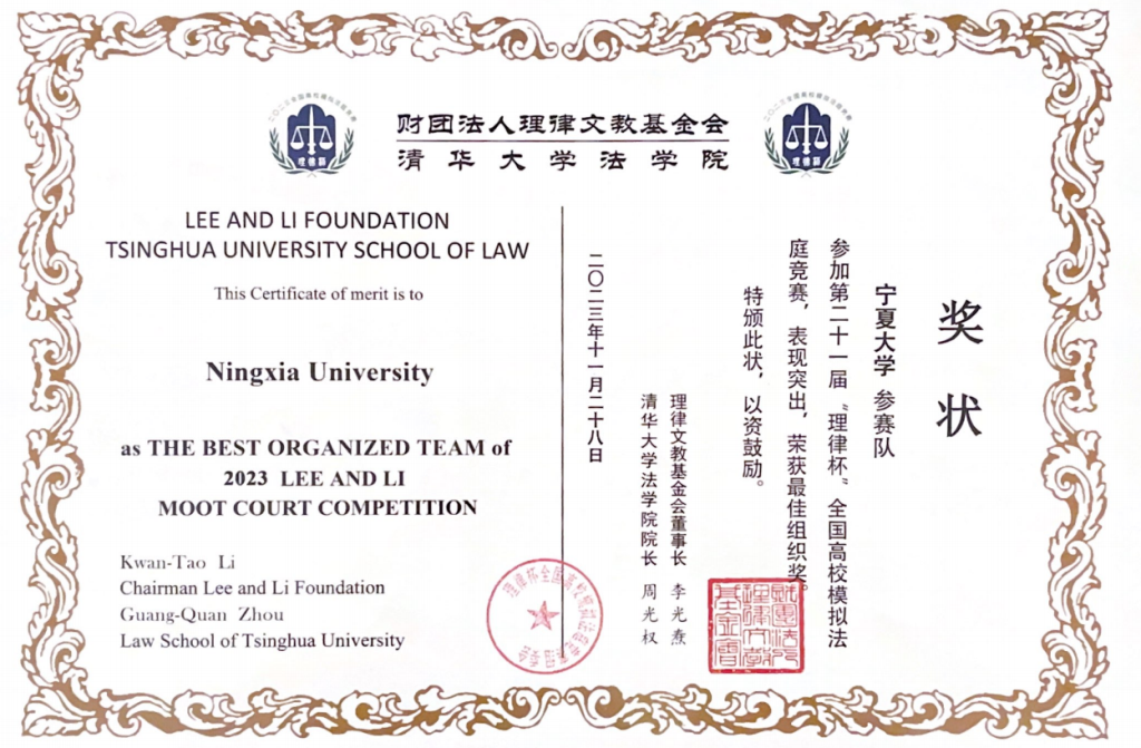 代表队凭借着其优秀的组织能力、协作能力和参赛选手在场上有条不紊的配合,最终亦获得“最佳组织奖”的称号。秦子禄同学通过其扎实的法学功底和在模拟法庭上出色的表现,获得宁夏代表队的“最佳辩手”的称号。