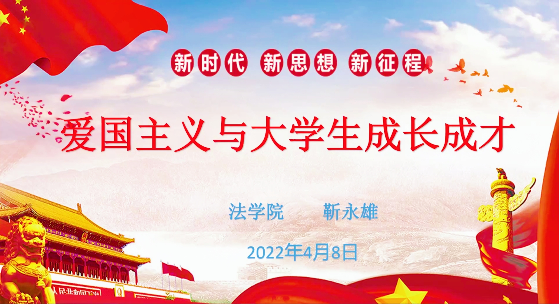 讲座伊始,靳永雄带领学员聆听爱国歌曲,观看《这就是中国》《中国一分钟》短片,并通过对民族英雄和当代爱国英雄人物的介绍,阐明了中华民族爱国主义传统的含义与时代价值。随后,靳永雄向学员们诠释了新时代的爱国主义,强调了新时期爱国主义的内容和特征,对爱国主义与弘扬民族精神的内在联系作了进一步解释说明。靳永雄叮嘱学员们要以振兴中华为己任,增强民族自信心、自尊心和自豪感,肩负起爱国的使命和责任,为祖国的繁荣富强努力学习。最后,他带领大家重温了习近平总书记对新时代青年人的六点期望和总书记关于爱国主义的重要论述,并号召学员们做新时代坚定的爱国主义者。