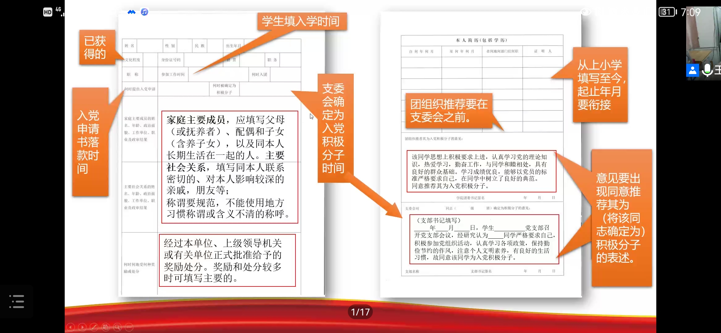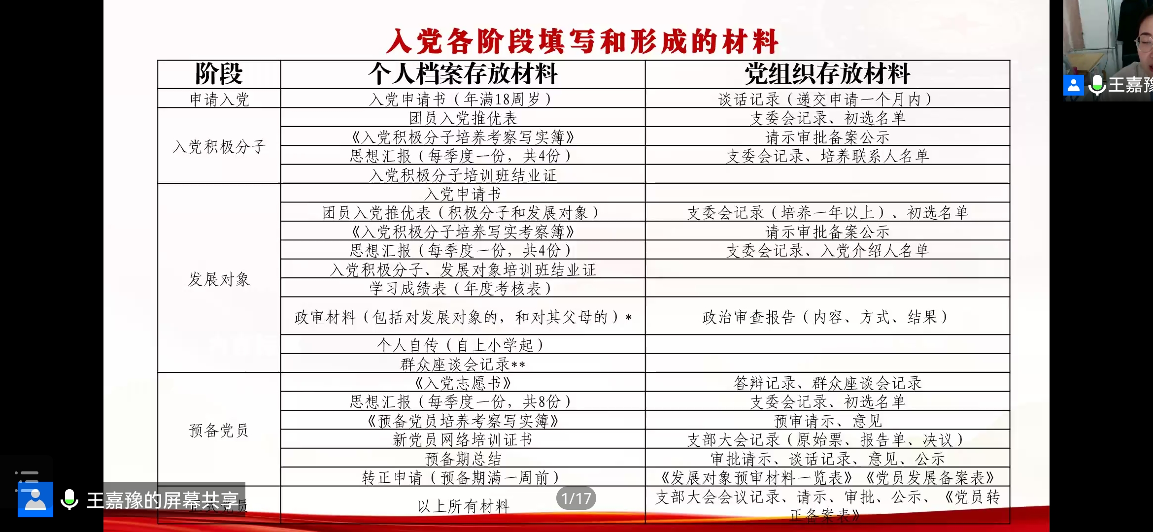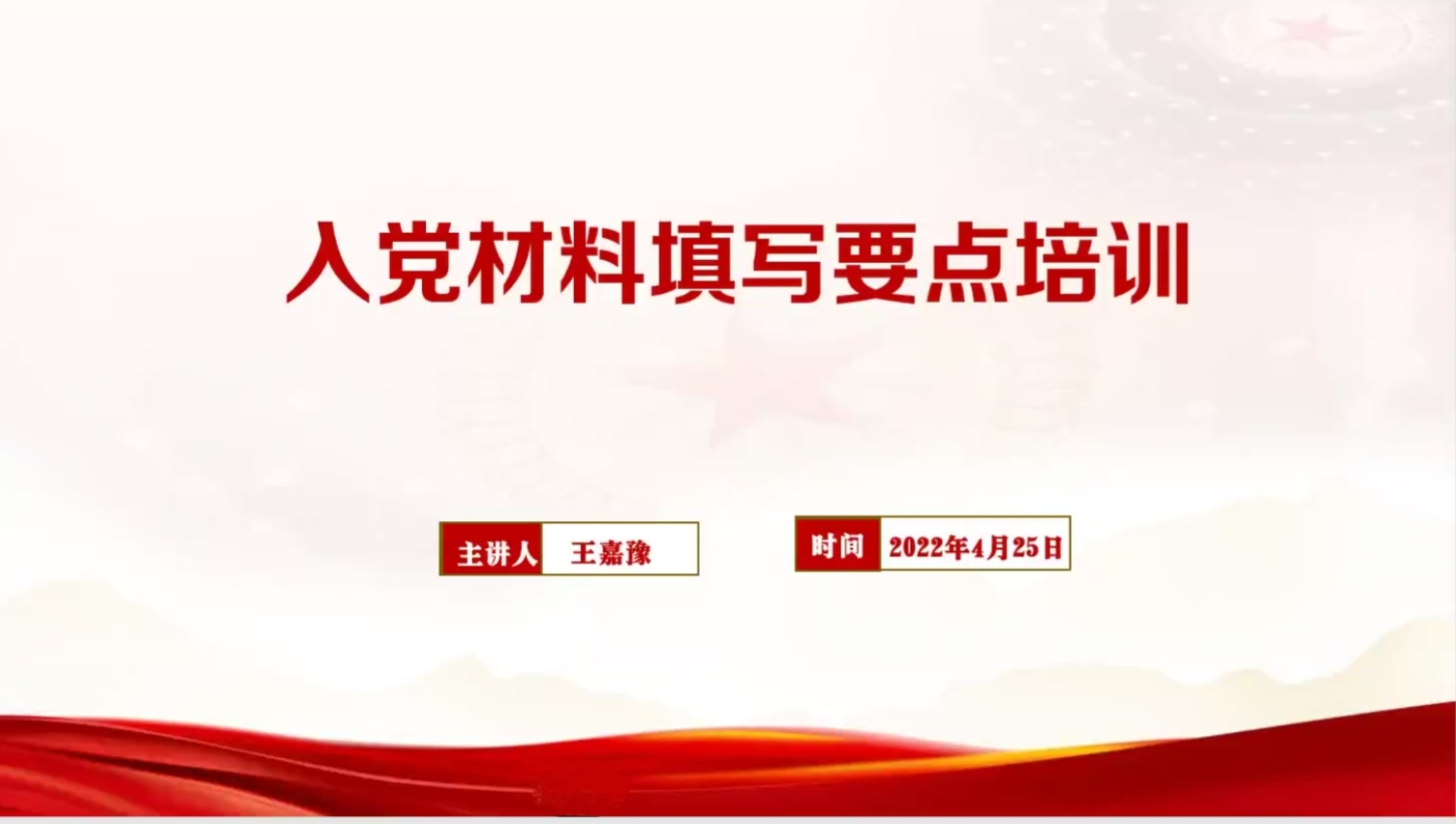 团委书记王嘉豫为英式21点分党校第四十一期入党积极分子、第十五期发展对象培训班和第十四期“青年马克思主义者培养工程”暨团学骨干培训班于线上开展以“入党材料填写要点”为主题的党课培训,培训班全体学员参加。