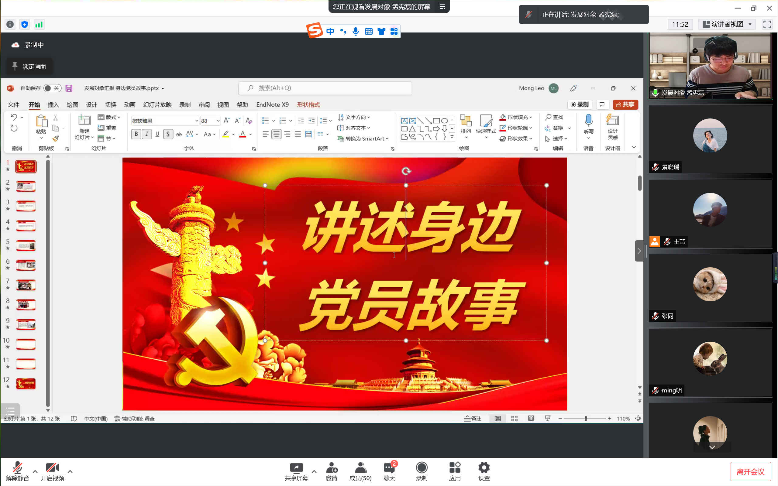 学生处综合科曹楠同志的事迹,他对工作认真的态度深深打动与会同志;2020级李雪玉讲述了毛洪亮同志的事迹,他创建的干部“一助扶贫帮困活动”被全生产建设兵团推广,多次被评为“优秀党员”;2020级郝琦讲述了赵志范同志如何做一个既伟大又平凡的人;2021级王果讲述了西吉县龙王坝村副书记焦建鹏作为一名农村致富带头人的故事。一个个生动的故事使与会同志深受感动的同时,也更加坚定了自己的理想信念,在榜样的鼓舞下,立志从小事做起,从身边事做起,用自己的行动积极向党组织靠拢,争取早日成为一名光荣的共产党员。
