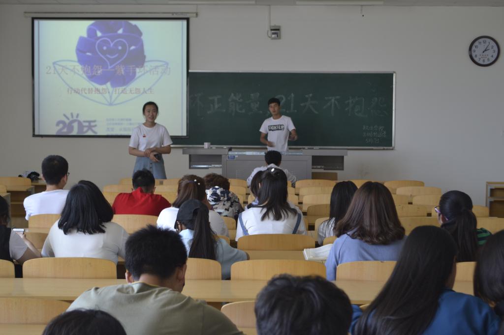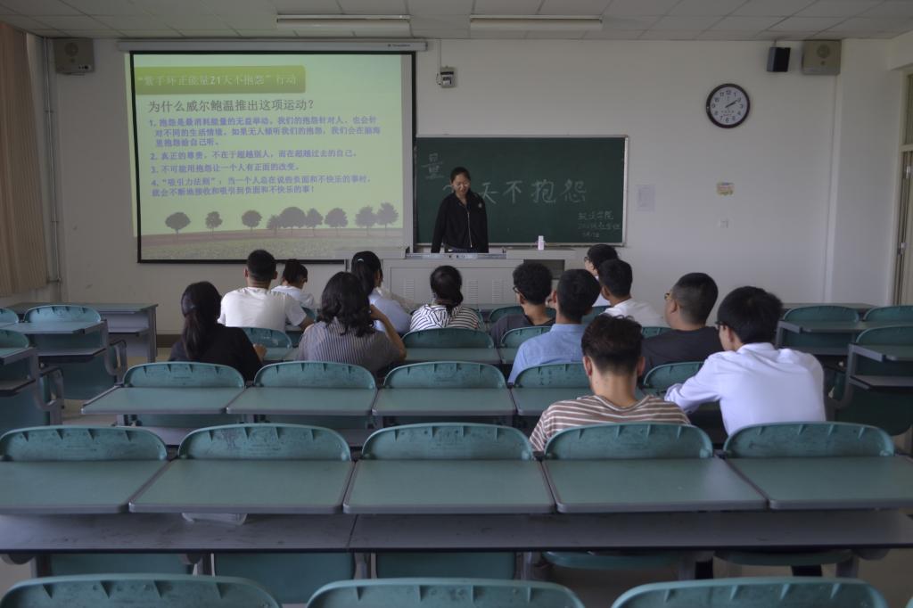 2016级各专业以团支部为单位,在贺兰山校区文科楼315、332、334、336教室,组织开展了心理健康月“紫手环正能量 21天不抱怨”主题团日活动。