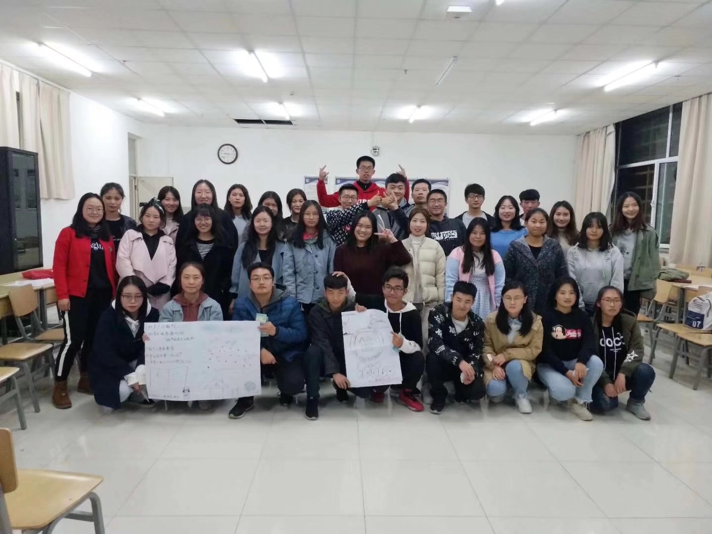 朋辈心理辅导员对本次活动向同学们做了详细说明。在辅导活动中,同学们首先在朋辈心理辅导员的引导下,通过自我介绍、分组合作比拼等趣味活动,增进了同学间的感情,现场欢声笑语,气氛和谐温馨。同学们踊跃发言,总结自己入学以来所思所感所惑,朋辈心理辅导员认真解答了大家的疑惑,并组织同学们针对如何增强班级凝聚力展开了讨论。紧接着,各组同学齐心协力绘制班级理想蓝图,将自己对未来的期望凝于画纸之上,表露出对班级的祝福。最后,本次活动以同学们在照相机前的笑颜圆满结束。