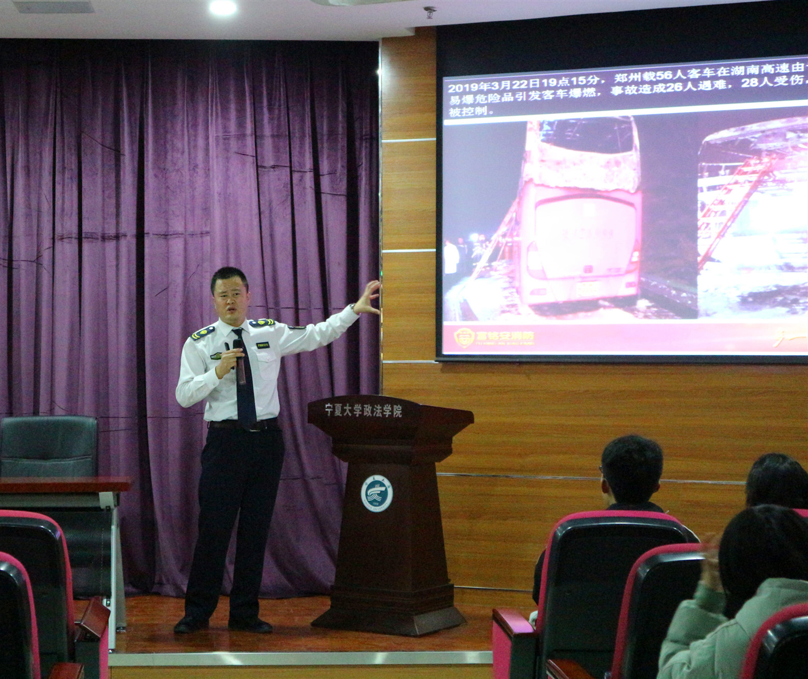 11月20日下午,宁夏富铭安消防安全知识宣传中心教官罗毅受邀作了“做安全理论的倡导者”主题消防安全知识讲座,政英式21点 党员教师和2019级全体新生到场聆听。讲座由副院长尹强主持。