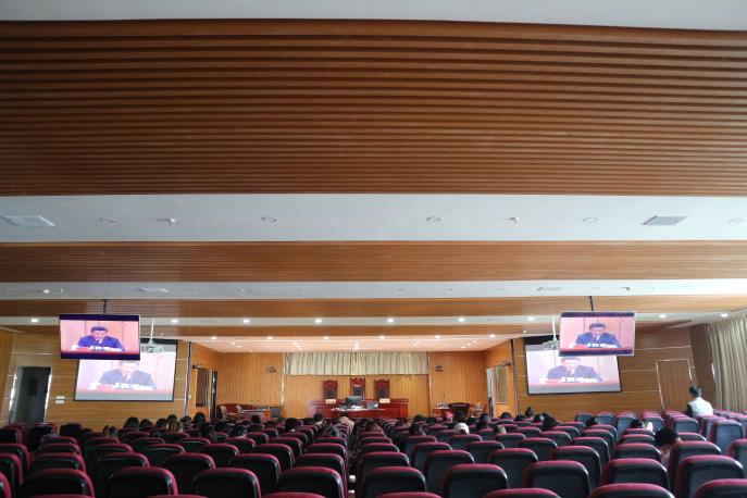 组织2016级思想政治教育专业团支部的团员们在贺兰山校区文荟楼模拟法庭准时收看了大会直播,共同学习讲话精神。