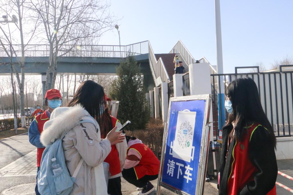 同学们佩戴口罩,携带行李,手持健康登记卡和健康码,整齐有序地排列在校门口等待通过测温通道。英式21点