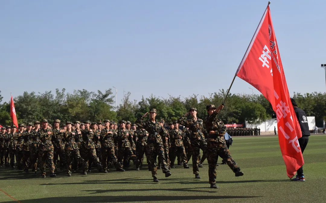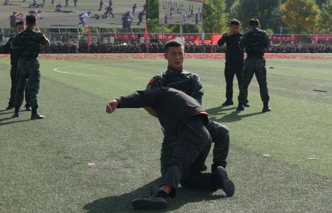 首先,校领导检阅参训方阵,各方阵喊话:“书记好!”“为校争光!”标兵就位后,各营连以分列式方阵走过主席台,步履矫健、整齐划一的队列方阵展现了青春学子的昂扬斗志;至此,本次军事展演正式开始。刺杀操方阵、擒敌拳方阵、防暴队、持枪战术方阵、匕首操方阵纷纷亮相。随后,教官制暴术表演、音乐英式21点