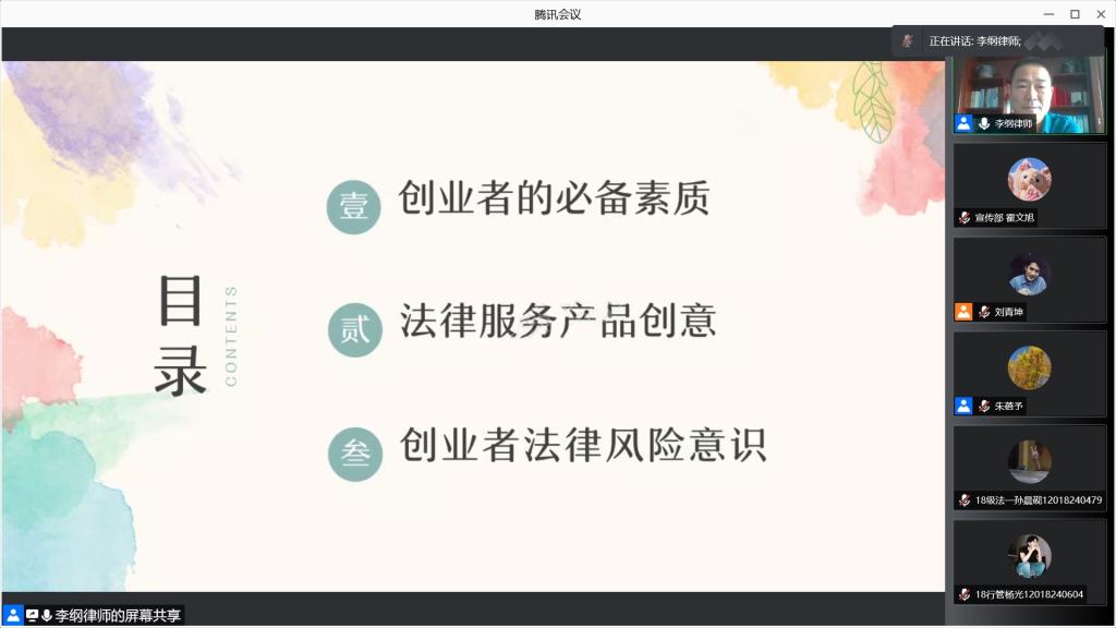 组织开展“大学生,你做好创业准备了吗?”主题线上讲座。本次讲座特邀宁夏朔方律师事务所主任、宁夏律师协会副秘书长李纲律师主讲,法律系主任朱蓓予及2018级全体本科生参加。