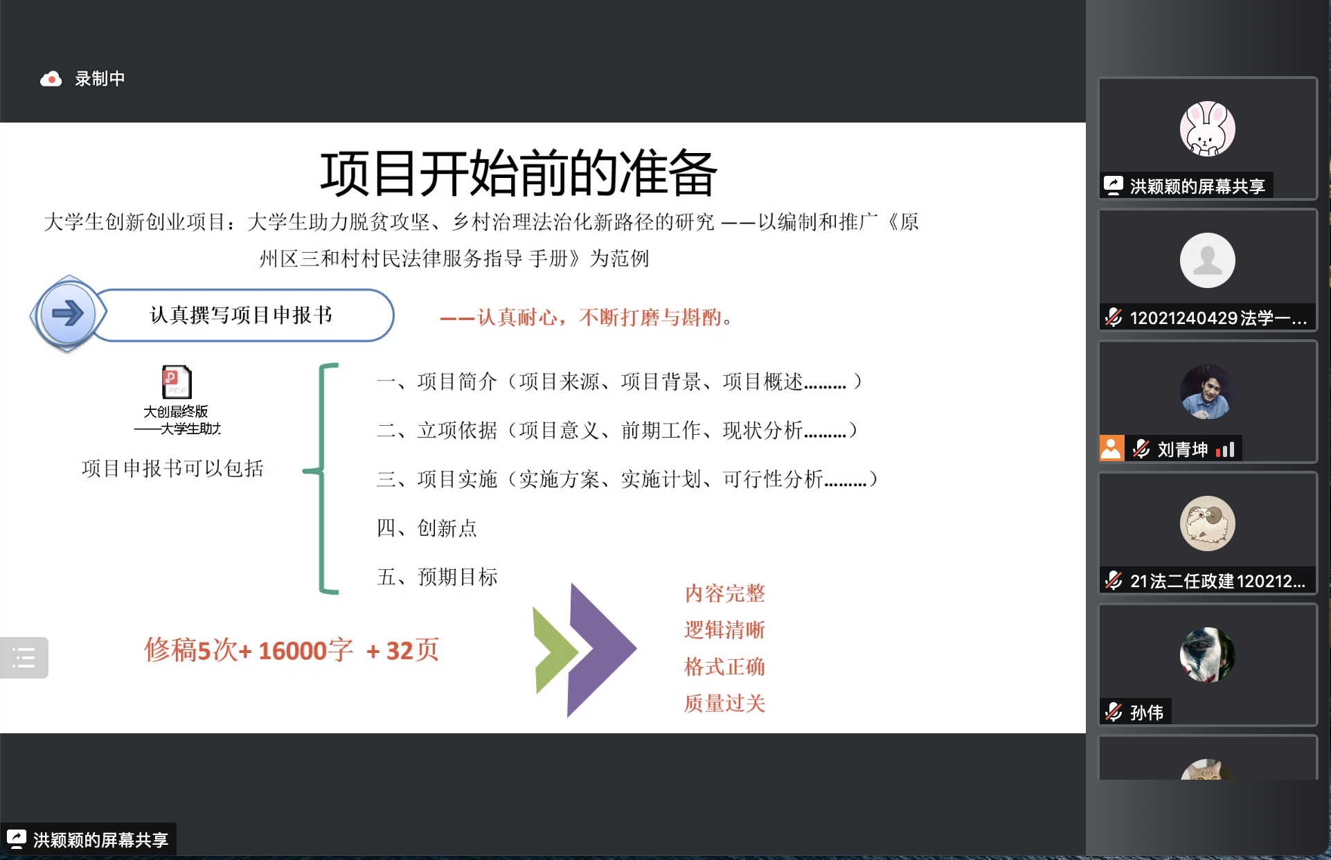 培训中,2018级洪颖颖和2020级战奇两位同学还分享了自己的项目经验与成果,并结合亲身实践经历,提出了积极的建议与意见,为本次参与大创的学生提供了有益的借鉴与参考。