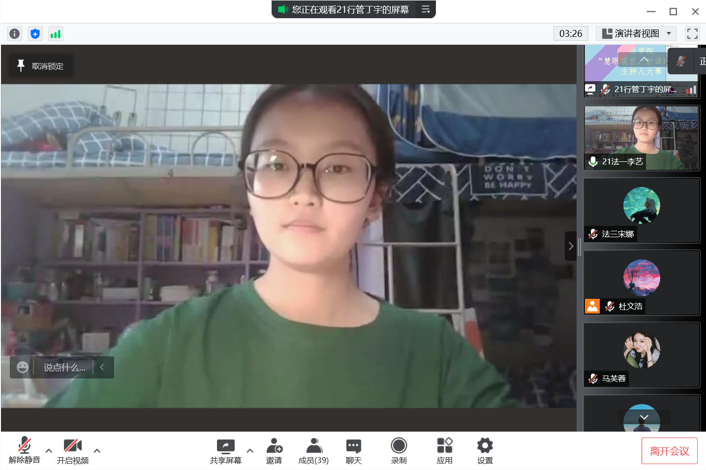 “慧眼观世,妙语动人”主持人大赛于线上成功举办。本届比赛由2021级李艺、陆嘉欣主持,部分学生作为观众线上参加。