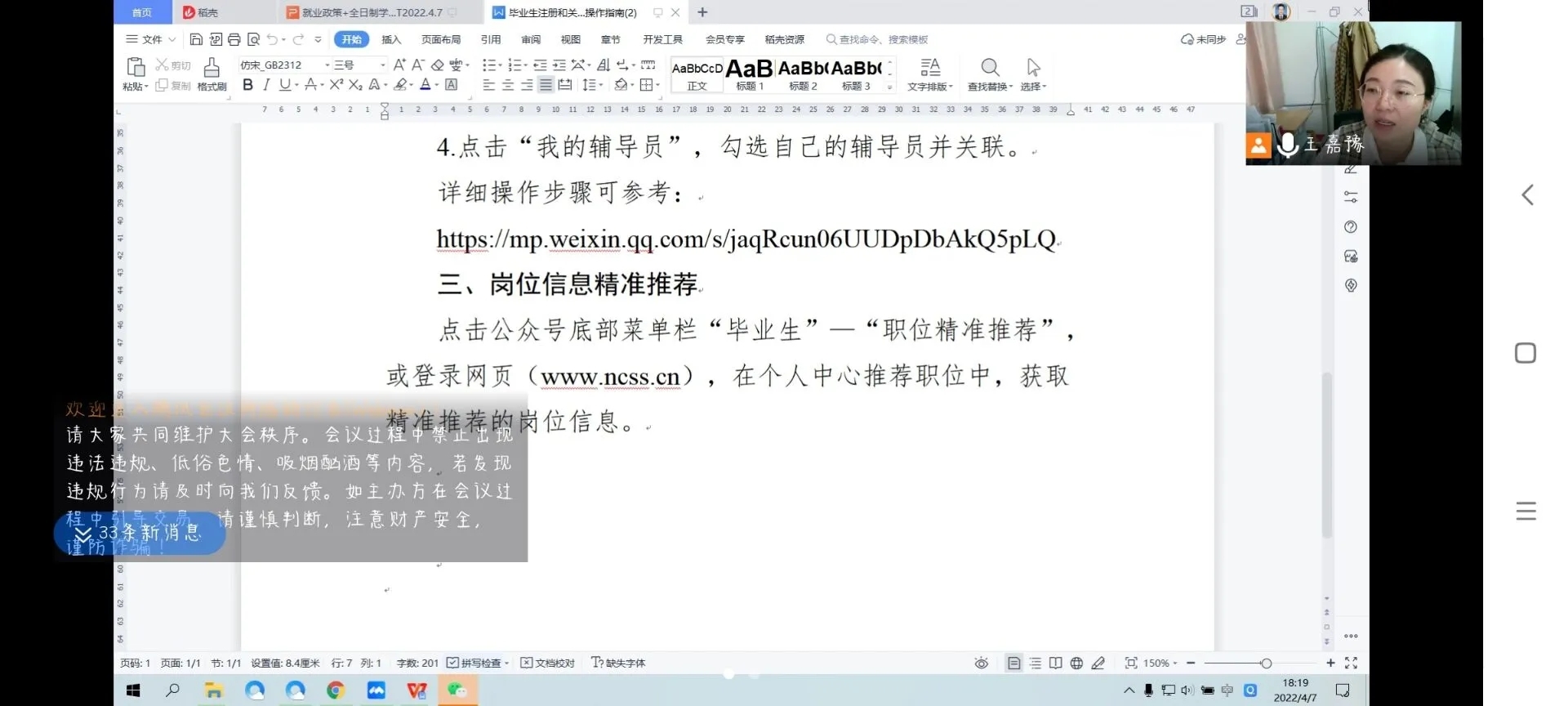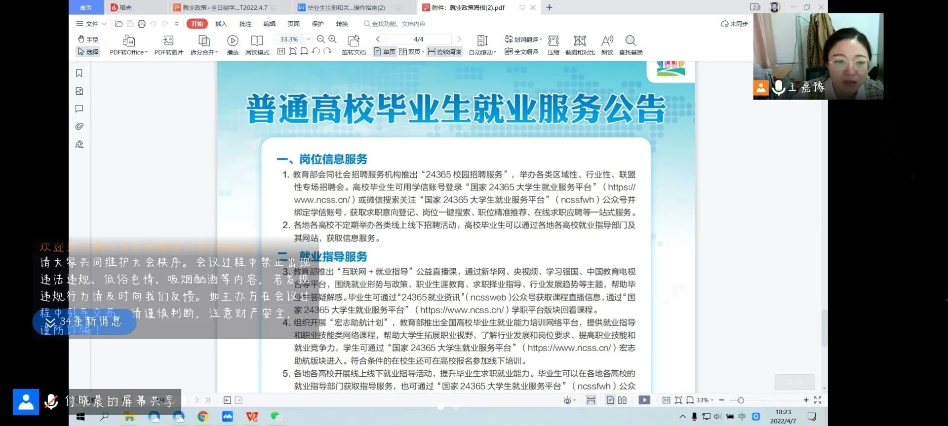 为提供精准就业创业指导服务,扎实推动2022届毕业生就业创业工作,4月7日下午,英式21点面向2022届毕业生开展以“2022年高校毕业生就业创业政策宣讲”为主题的宣讲会。会议由学生工作办公室主任王嘉豫主持,采用腾讯会议的形式召开,全体2022届毕业生参会。