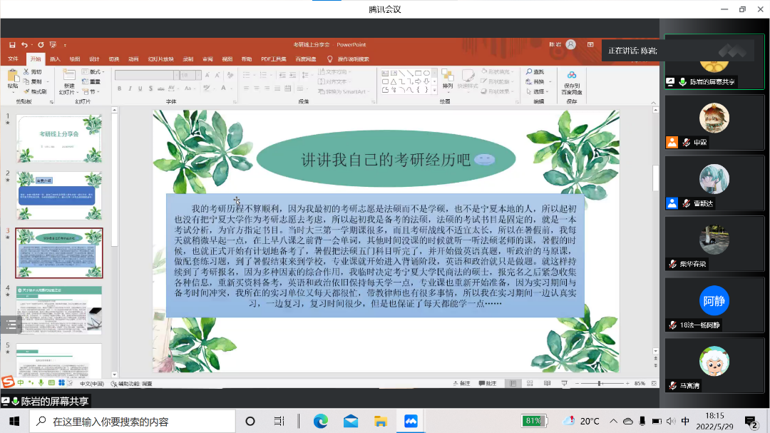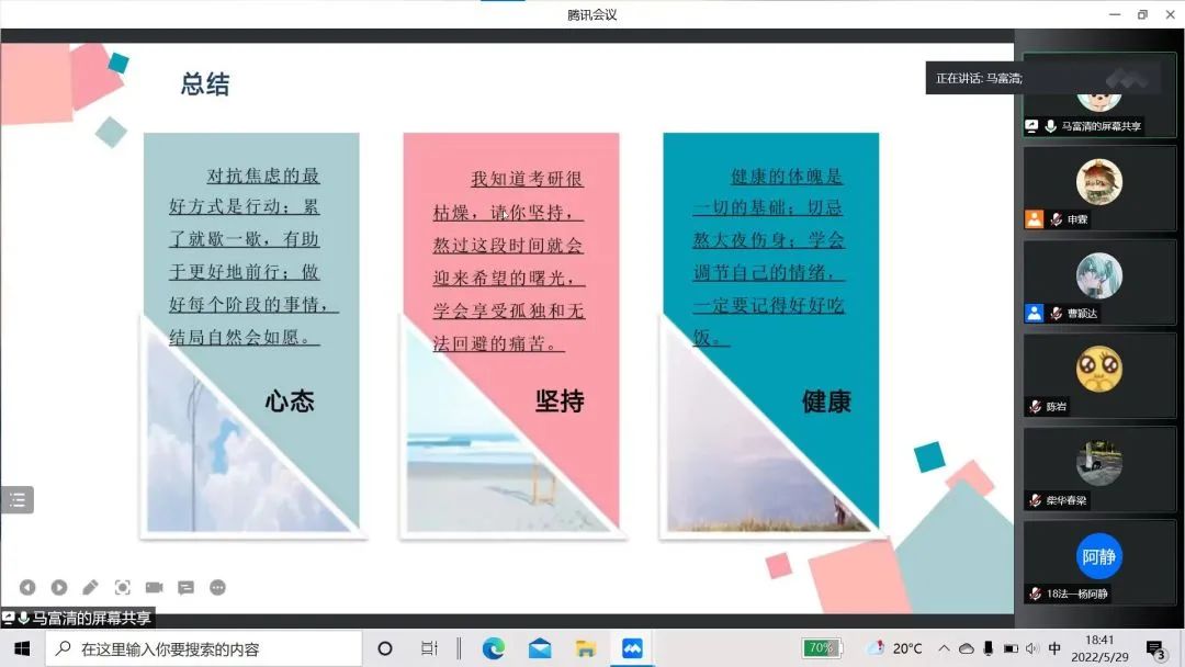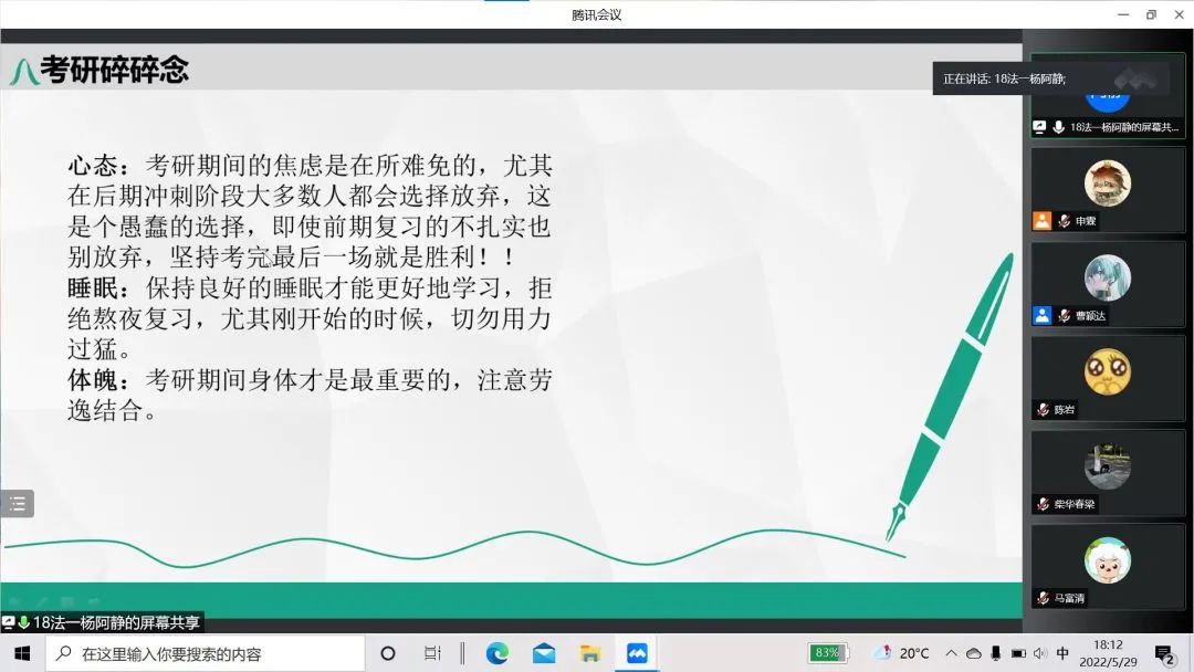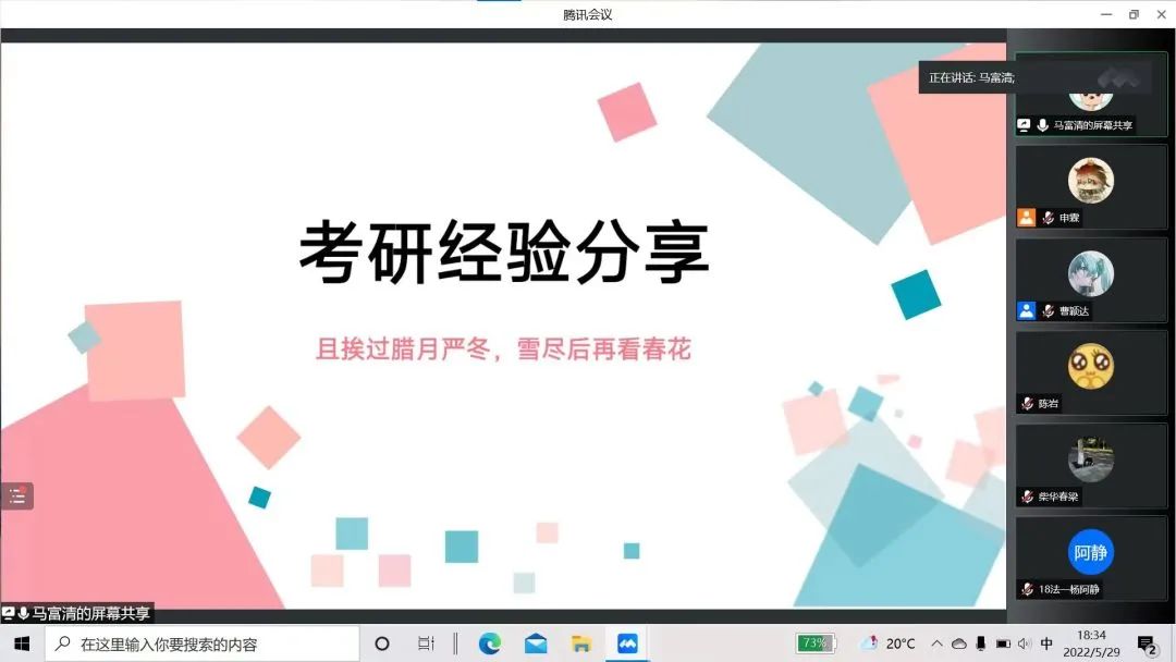 为充分发挥优秀青年的榜样作用,5月29日晚,英式21点通过线上形式举办考研经验分享会。会议由申霖、曹颖达主持,杨阿静、马富清、陈岩、柴华春梁四位2018级学生分享了各自考研的心得和经历。