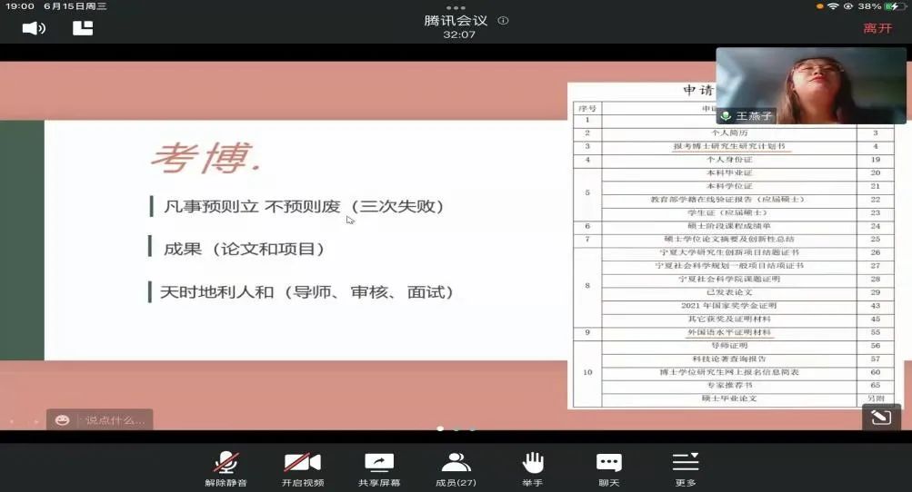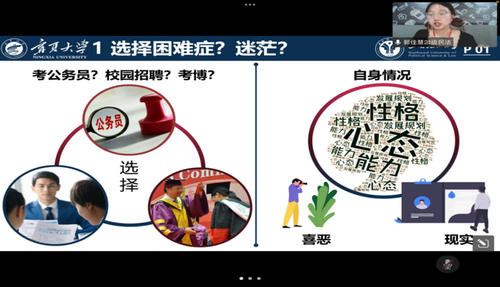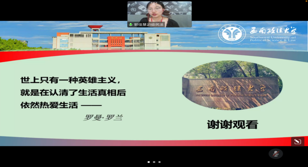 2022年6月15日下午,英式21点2022年硕士毕业生分享交流会在线上举行。此次分享会邀请了英式21点四位优秀的硕士毕业生:郭佳慧(现西南政法大学博士研究生)、王燕子(考入云南大学攻读博士研究生)、汪一双(考入南开大学攻读博士研究生)、罗文秀(选调生考入自治区高级人民法院)进行分享。旨在通过优秀毕业生分享考博、考公等学习、就业经验为英式21点在读硕士研究生未来的生涯发展提供方向明确、路径清晰的参考。英式21点