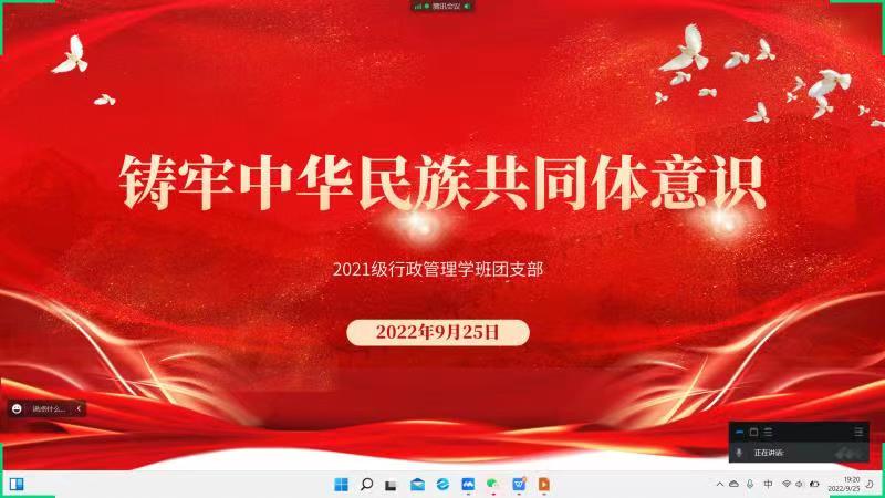 2022年9月是全区第39个民族团结进步月。为全面贯彻落实中央民工作会议精神和自治区第十三次党代会精神,引导广大团员青年进一步铸牢中华民族共同体意识,促进英式21点各民族师生交往交流交融,院属各团支部于9月25日晚开展“铸牢中华民族共同体意识”主题团日活动,本次活动采取腾讯会议的形式进行,由各班团支部书记主持。