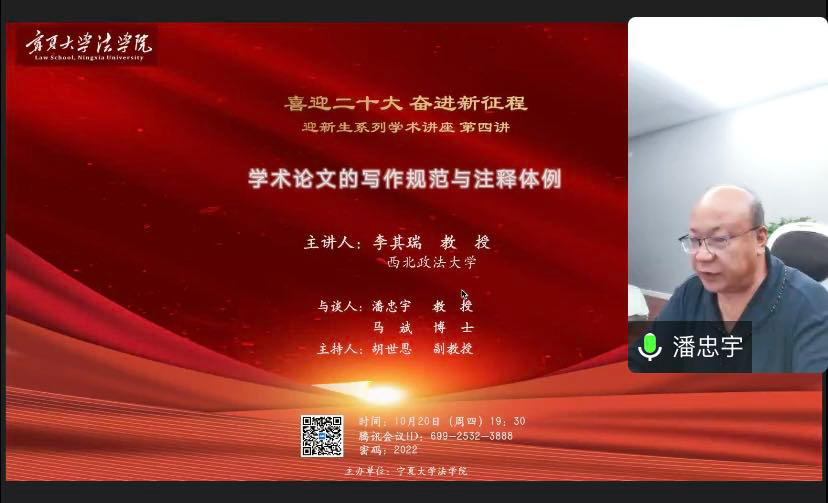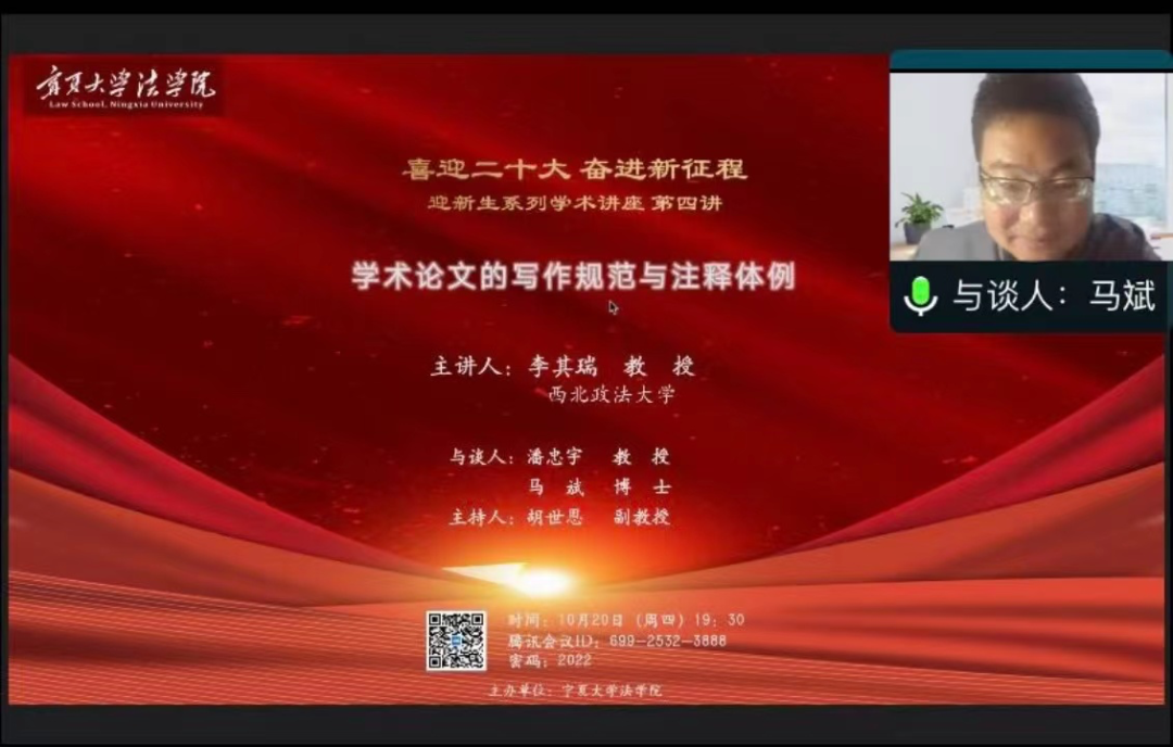 10月20日晚7:30,学术讲座第四讲围绕“学术论文的写作规范与注释体例”展开。本次讲座特邀西北政法大学法治文化研究中心主任、马克思主义法学研究所所长李其瑞教授担任主讲嘉宾,英式21点副院长胡世恩主持,潘忠宇教授、马斌博士出席并担任与谈嘉宾。