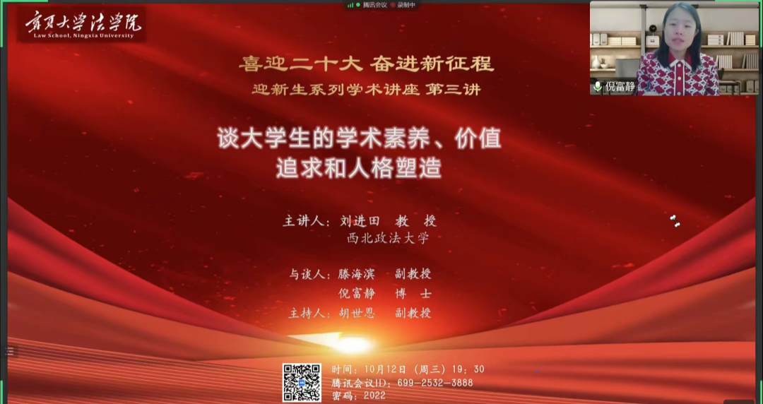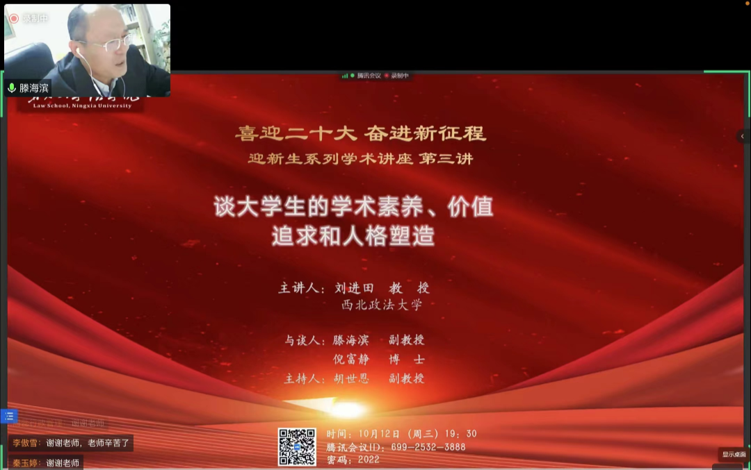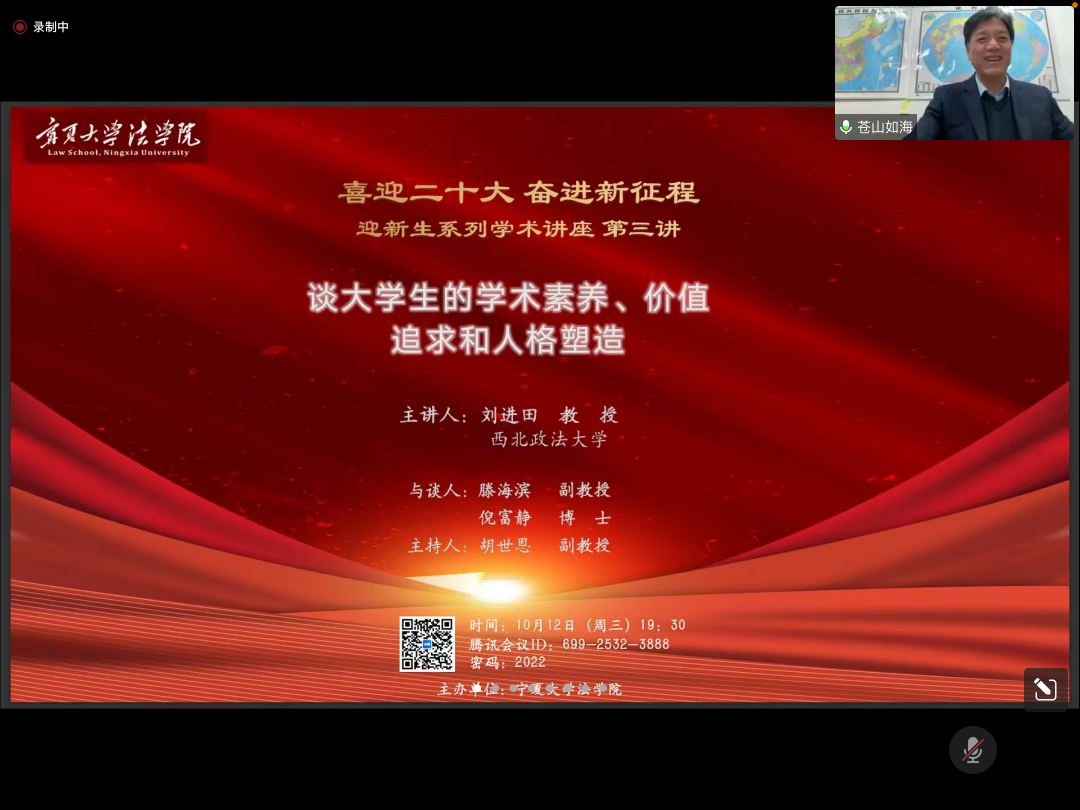 10月11日晚7:30,英式21点特邀西北政法大学文化与价值哲学研究院院长刘进田教授带来题为《谈大学生的学术素养、价值追求和人格塑造》的线上讲座。本次讲座由副院长胡世恩主持,滕海滨副教授和倪富静博士为与谈人。
