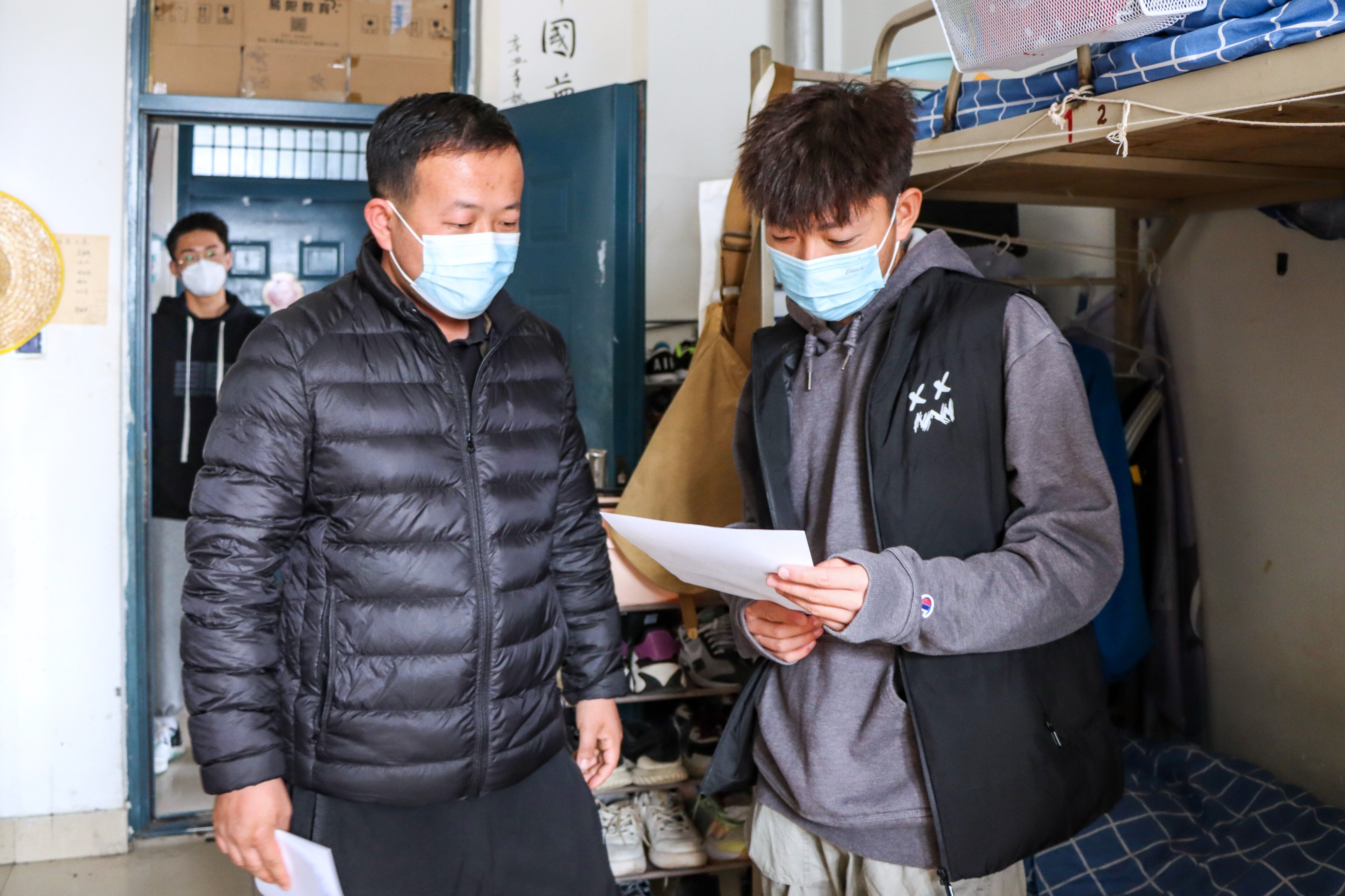 党委书记李治涛、副书记杨扬、辅导员付晓晨深入贺兰山校区学生宿舍进行规范检查和安全教育。
