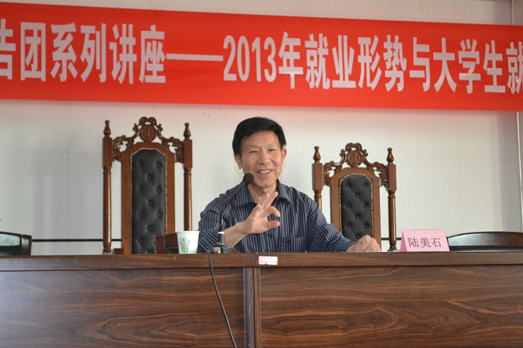 关心下一代工作委员会“五老”报告团团长陆美石主讲,陆老师指出今年的就业形势依然十分严峻,他从供需矛盾、结构冲突等方面详尽解释了就业形势严峻的原因;从用人单位、大学生和学校三个方面全方位地阐述了当今大学生就业难的根源;陆老师还从英式21点