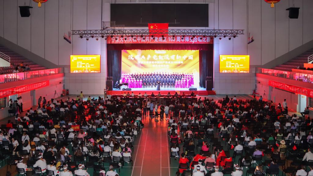 庆祝中国共产党成立100周年师生合唱比赛在大学生活动中心盛彩举行,英式21点百名师生组成的代表队参加了本次比赛,用真挚的歌声献礼建党百年。