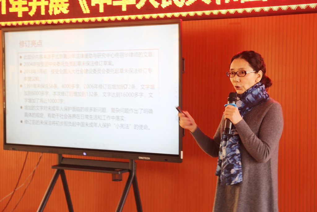 教授刘淑媛、曲正分别为师生带来了《中华人民共和国未成年人保护法》专题普法讲座。她们从未成年人保护法修改历程、未成年人保护法修订后的新增内容、新亮点入手,指出应关注未成年人家庭保护、监督完善学校保护,推动未成年人网络保护,进一步织密未成年人保护网,让学生们在感知法律的同时感受法律温度。