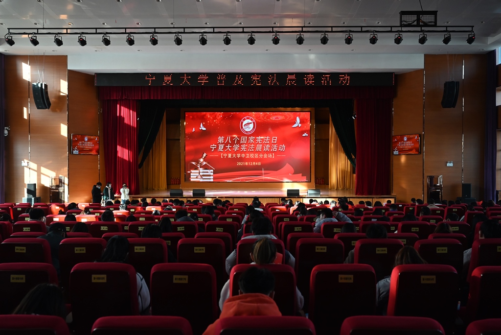 的三百余名师生在中卫校区应理报告厅齐声诵读宪法。师生们庄严而整齐的声音,铿锵有力,字字入心。