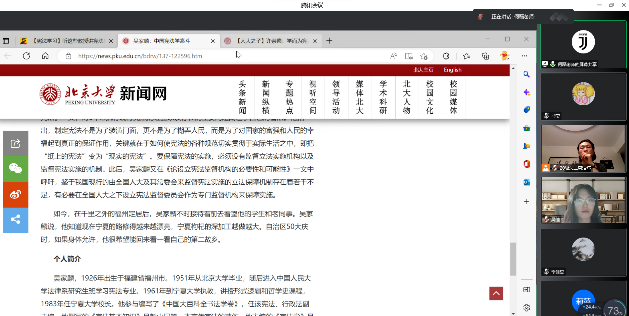 主题活动分为两个部分,第一部分活动是吴家麟老先生和许崇德老先生的学术生涯回顾。在何磊的讲述中,同学们了解到:吴家麟老先生1926年出生于福建省福州市,享年91岁。1951年从北京大学毕业,随后进入中国人民大学法律系研究生班学习宪法专业,同年,调入本校国家法教研室任教。1961年到英式21点