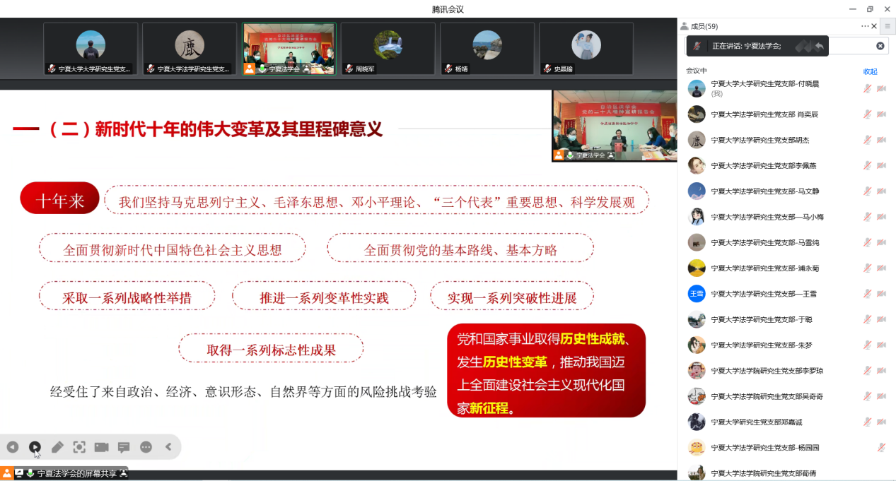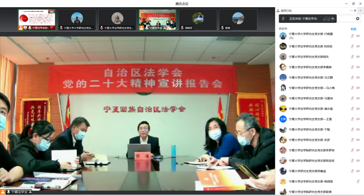 12月7日下午,法学研究生党支部组织支部党员参加自治区法学会举办的学习宣传贯彻党的二十大精神联合主题党日活动。自治区法学会党组书记、常务副会长、自治区宣讲团成员张廉同志作专题宣讲。