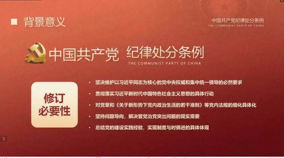最后,讲解了《中国共产党纪律处分条例》的修改要点在于总则部分增加了以习近平新时代中国特色社会主义思想为指导,同时在政治纪律部分增加了对在重大原则问题上不同党中央保持一致,搞山头主义、拒不执行党中央确定的大政方针,落实党中央决策部署打折扣、搞变通等行为的处分规定。