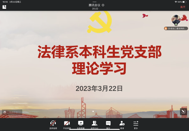 2023年3月22日下午,法律系本科生党支部在法律系办公室举行集体学习研讨,深入学习《习近平关于力戒形式主义官僚主义重要论述选编》。本次理论学习由组织委员唐浩玮主持,采用线上线下会议相结合的方式开展。